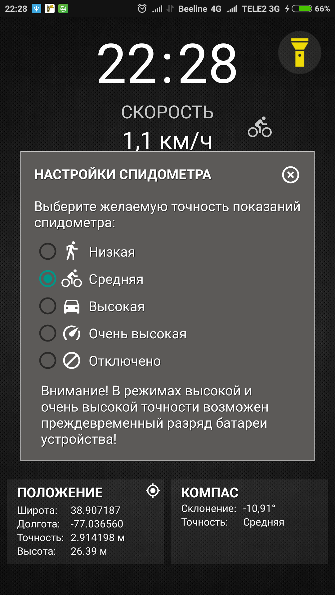Наш компас имеет встроенный спидометр с 5 режимами точности - выбранная точность будет определять потребление электроэнергии Вашим телефоном и позволит Вам продлить время его работы, что немаловажно в дали от розетки.