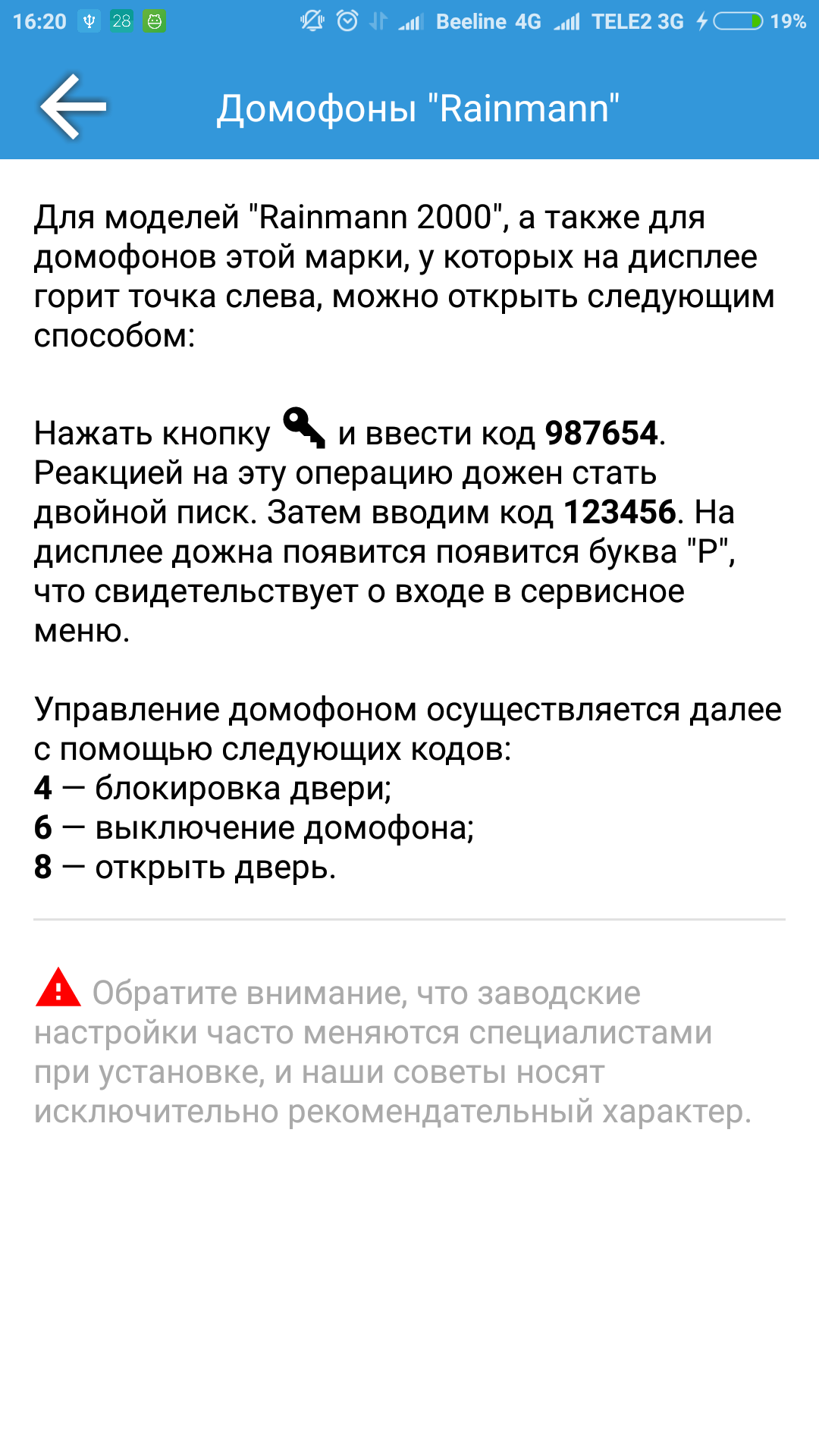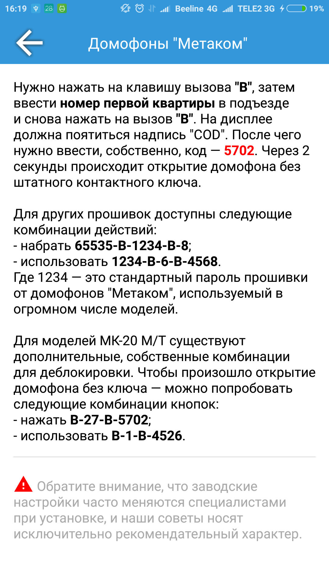 Данное приложение содержит информацию о сервисных кодах (иногда еще их называют секретными кодами) к популярным моделям подъездных домофонов. Если указанные коды не были изменены мастером-установщиком, то в большинстве случаев с помощью этих кодов можно открыть домофон не имея ключа без применения каких-либо специальных средств.Приложение поможет открыть дверь в экстренных случаях, при потере ключа, будет полезно для временного доступа для гостей, сервисных специалистов, почтальонов курьеров и прочих.