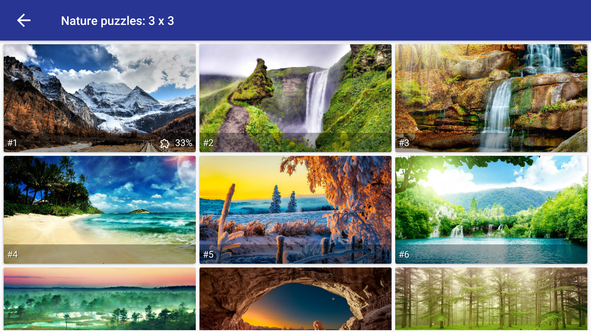 Это приложение - коллекция красивых фото пазлов природы и пейзажей с водопадами, горами, речками и другими радующими глаз вещами.Игра позволяет выбрать различный уровень сложности - от простого (3 х 3), до максимально сложного, где количество элементов ограниченно лишь размерами экрана Вашего устройства.