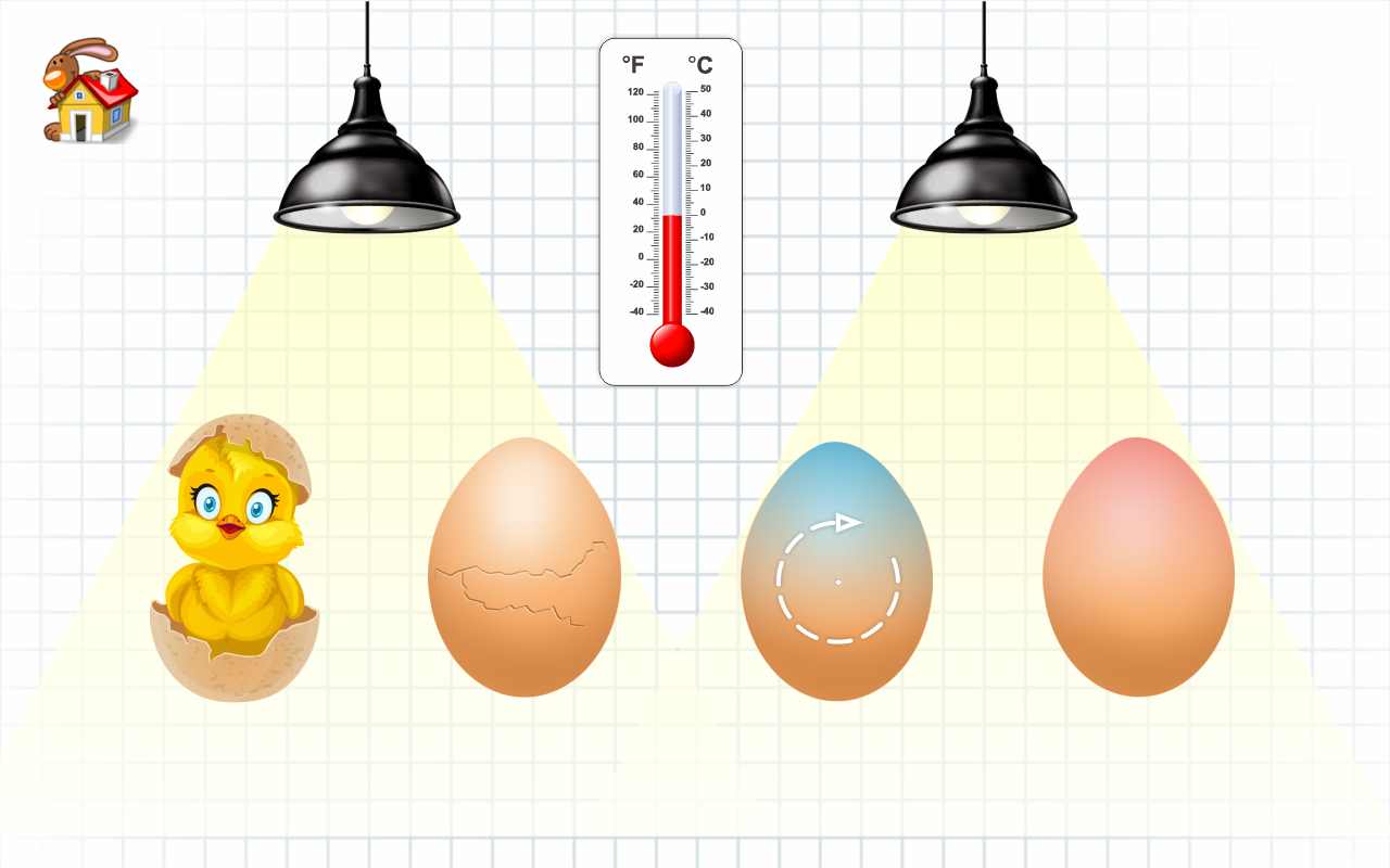 4. Инкубатор (что бы согреть яйца нужно включить лампы, переворачивать яйца, побрызгать их из пульверизатора, и, наконец, вылупятся цыплята)