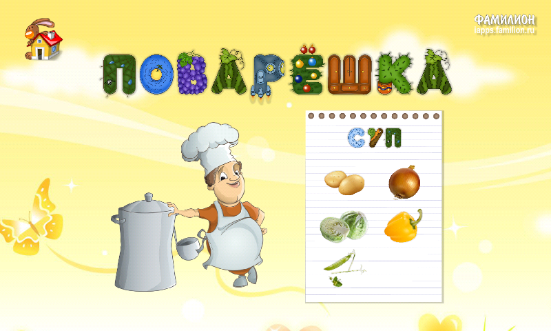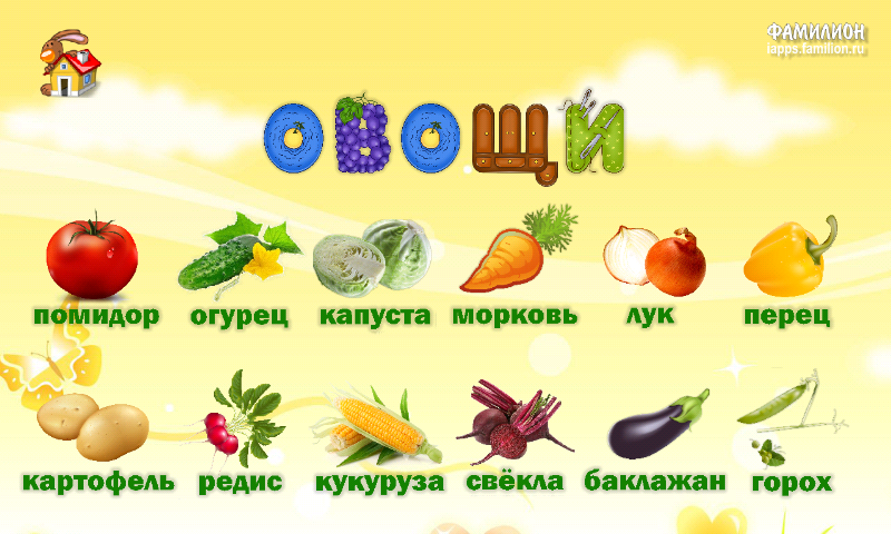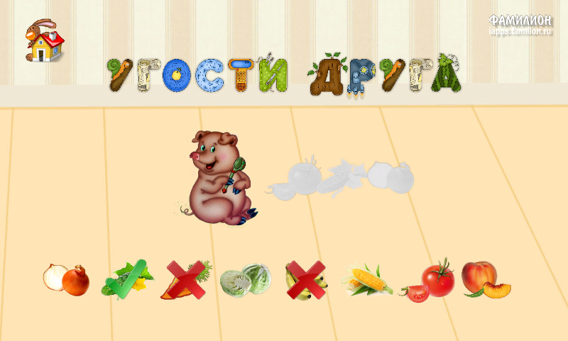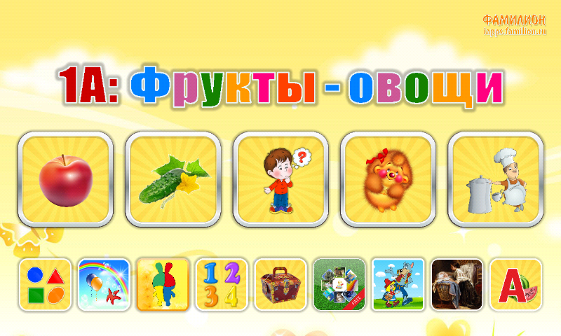Приложение "1А: Фрукты-овощи" поможет изучить малышам фрукты и овощи. Дети смогут узнать какие именно продукты относятся к фруктам, а какие к овощам, какого бывают цвета, где они растут, какие блюда из них можно приготовить. В игровой форме малыш сможет закрепить полученные знания и просто поиграть - угостить зверюшек их любимыми лакомствами, выбрать для бабушки-повара нужные ингредиенты для распространенных блюд.