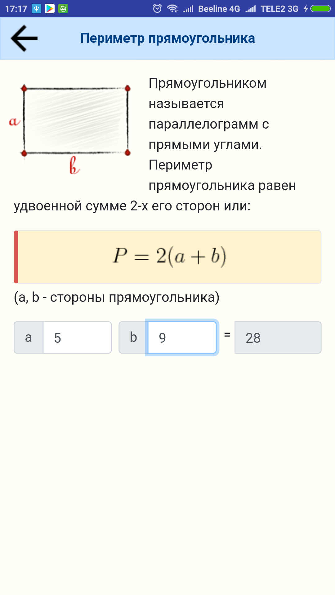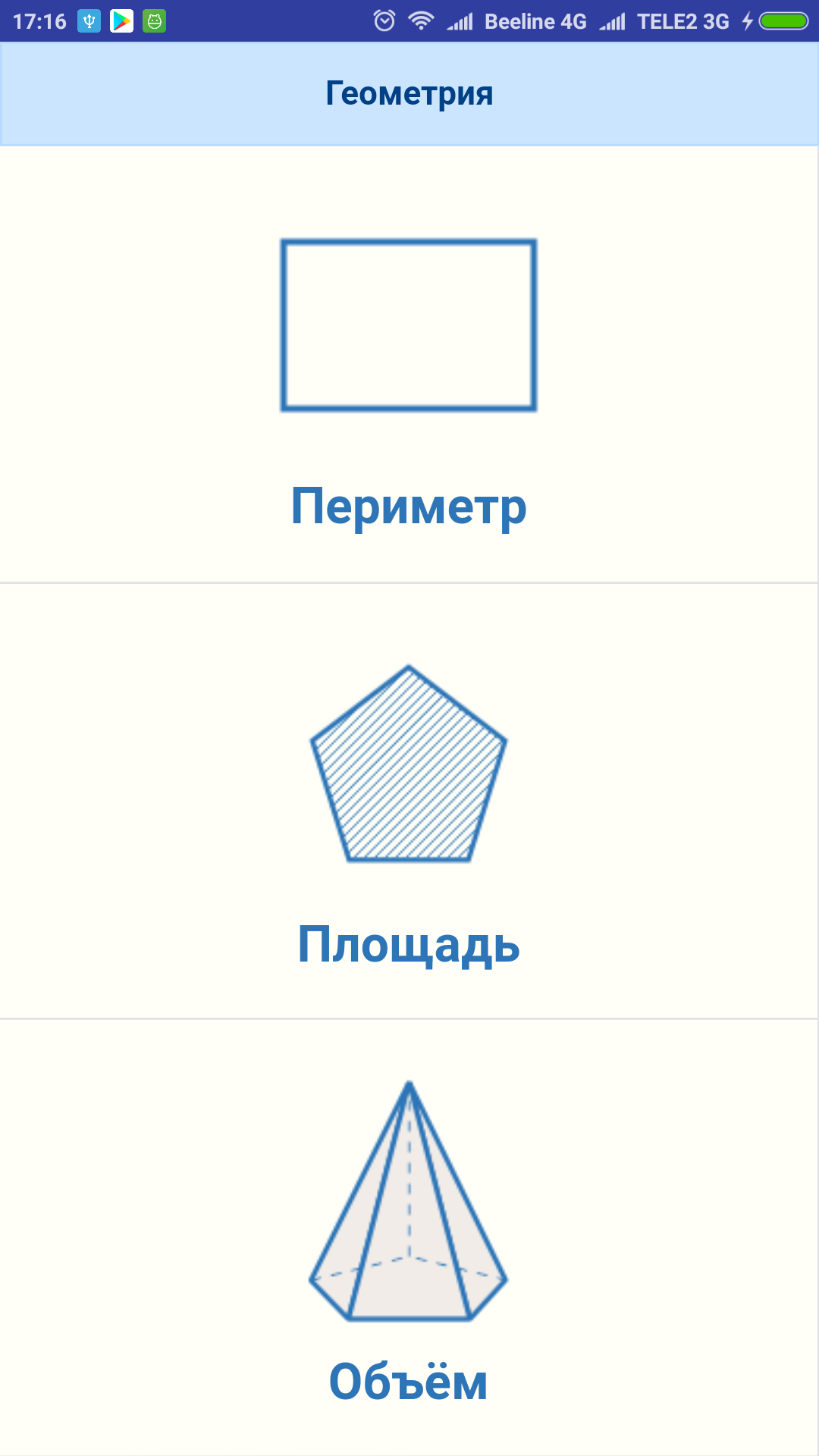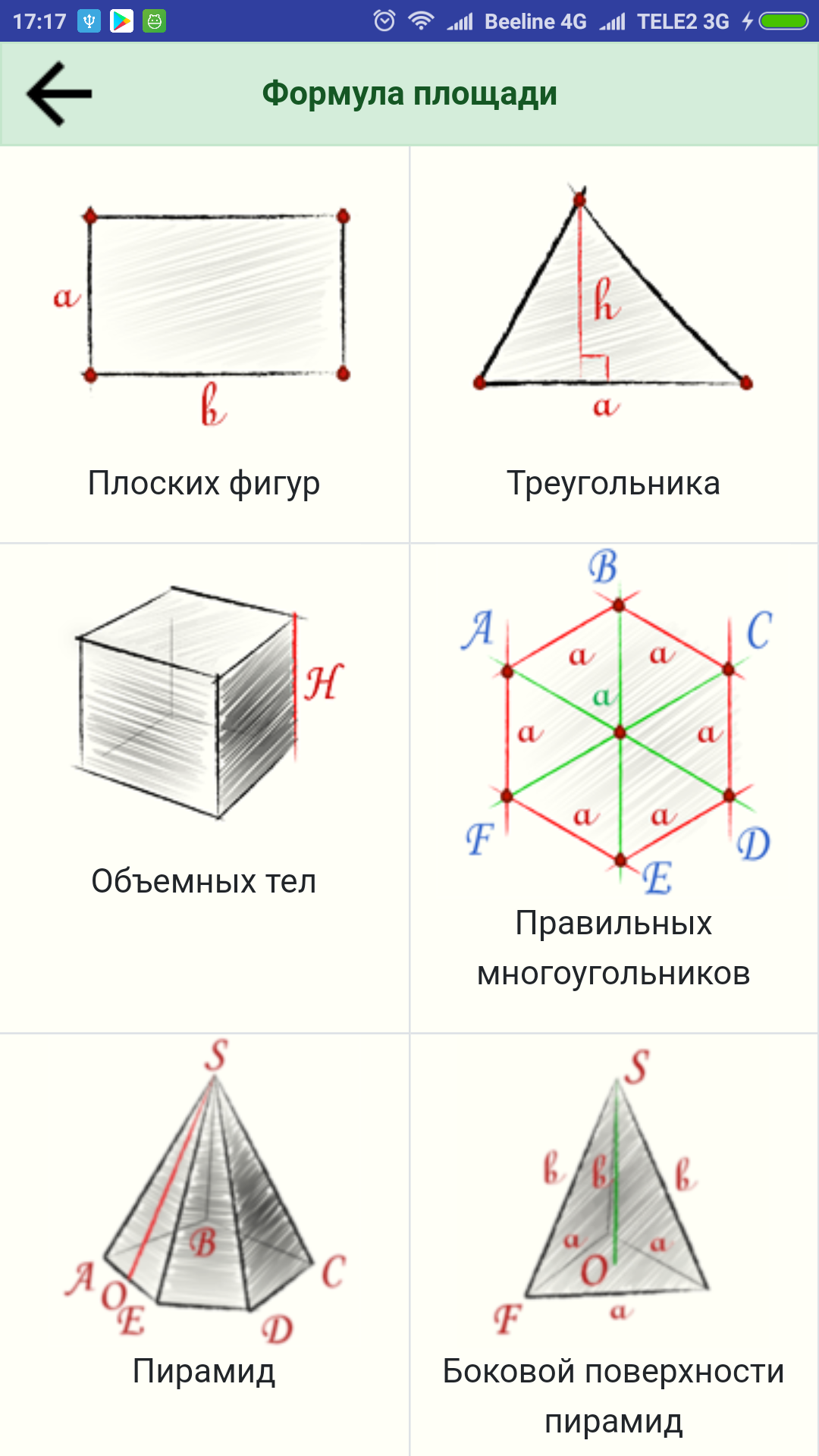 Это приложение – бесплатный справочник формул геометрии для вычисления периметра, площади и объема геометрических фигур и объемных тел.В разделе «Периметр» приведены формулы для следующих фигур: