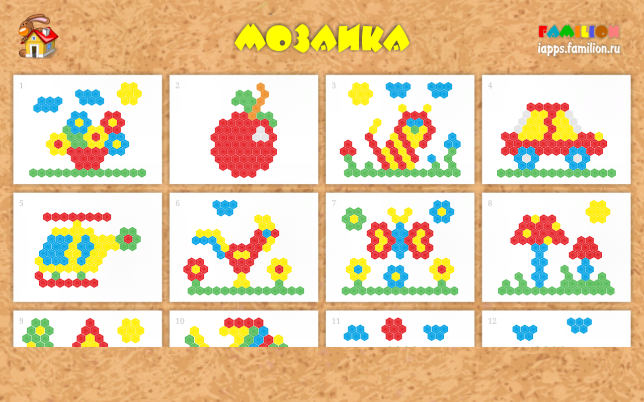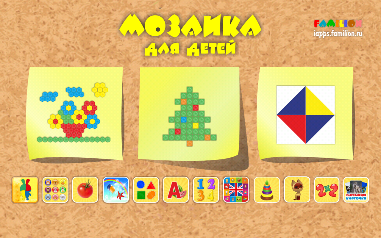 Мозаика для детей – это обучающее приложение, которое позволит Вашему малышу в игровой форме такие качества как образное мышление, внимание, воображение, память и мелкую моторику. В приложении имеется 3 варианта мозаики – с классической шестигранной фишкой, квадратной и в форме разноцветного кубика.В игре доступны более 100 вариантов увлекательных шаблонов различного уровня и сложности.
