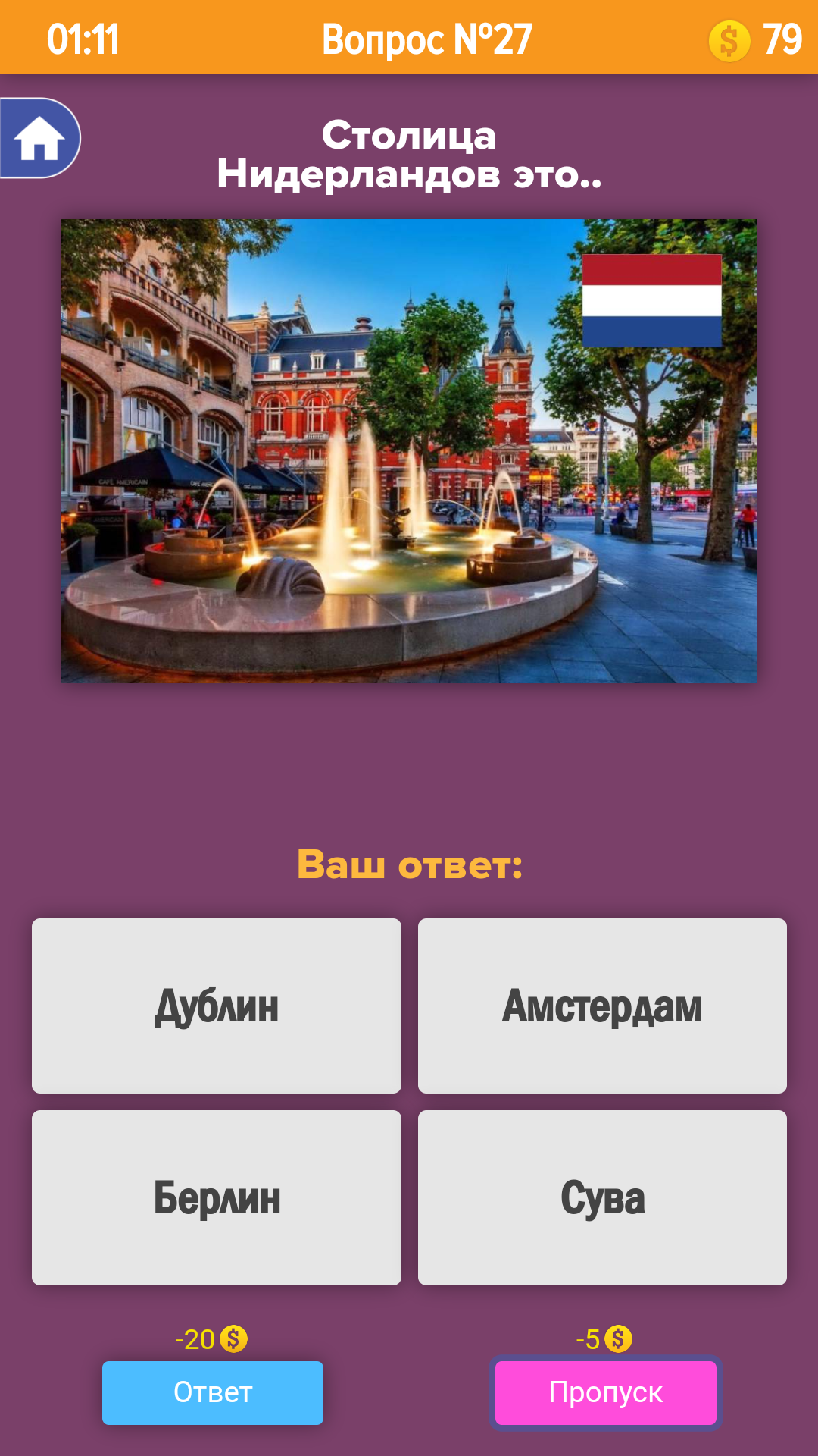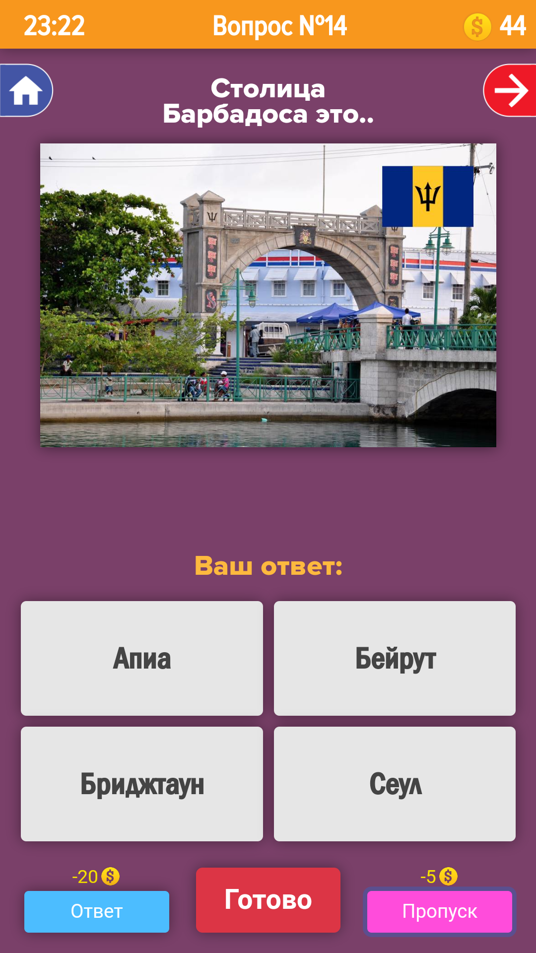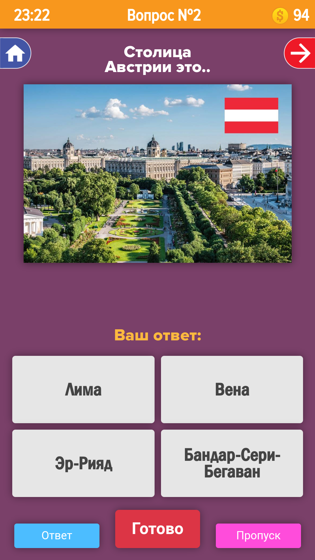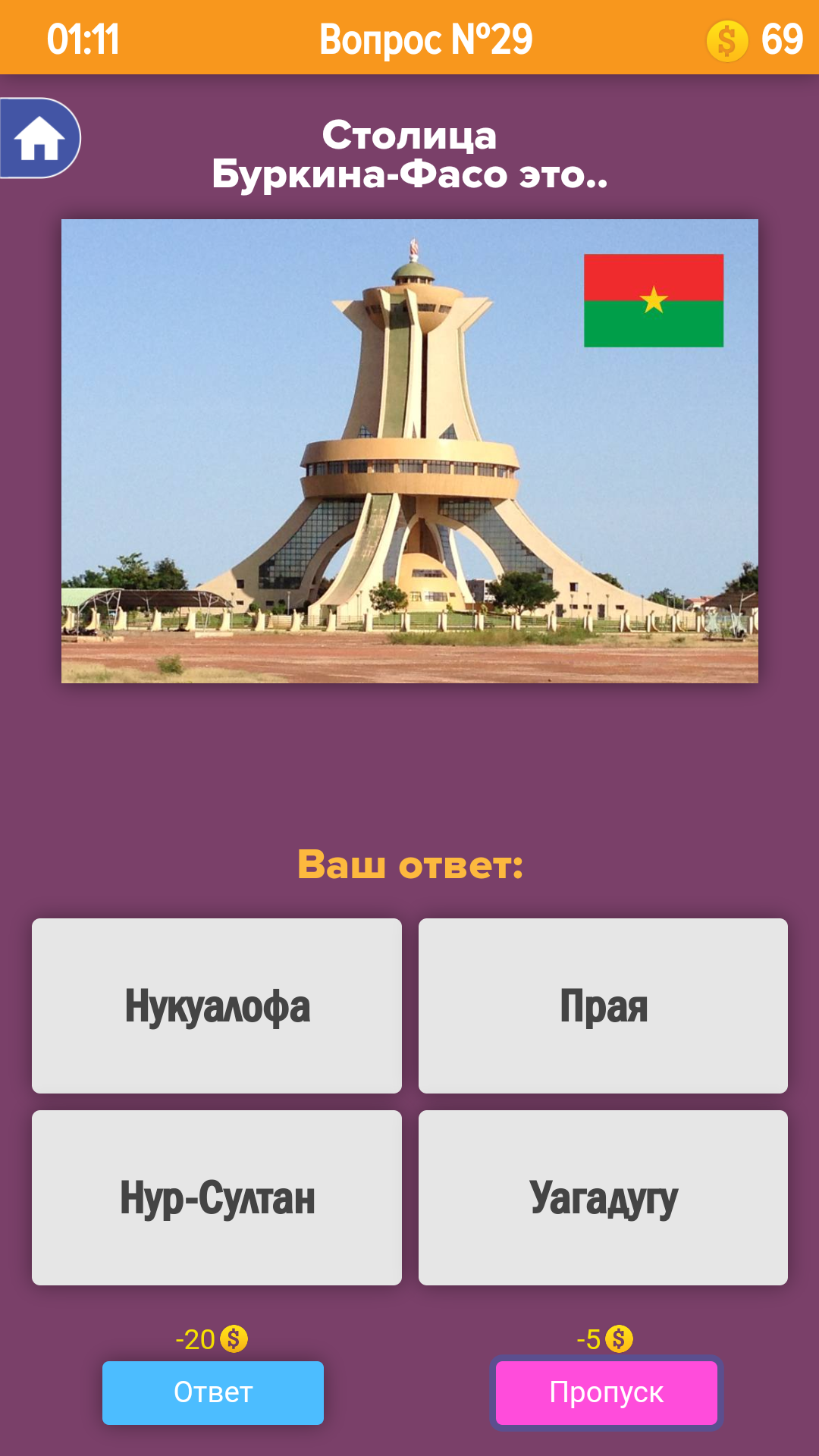 В этом приложении Вы сможете проверить и улучшить свои знания в области географии, а именно - столицы стран мира. Если Вы не знаете ответа на вопрос - его всегда можно пропустить кнопкой "Пропуск", а узнать правильный ответ при помощи кнопки "Ответ". За правильные ответы Вам будут начисляться поощрительные монетки, а за неверные - списываться. К пропущенным вопросам всегда можно будет вернуться позже.Также, запоминать столицу страны Вам будет помогать фото достопримечательности или известного места, располагающегося в столице страны.