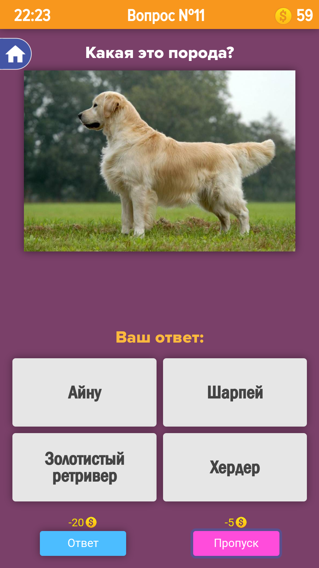 В этом приложении Вы сможете проверить и улучшить свои знания о породах популярных собак.Если Вы не знаете ответа на вопрос - его всегда можно пропустить кнопкой "Пропуск", а узнать правильный ответ при помощи кнопки "Ответ". За правильные ответы Вам будут начисляться поощрительные монетки, а за неверные - списываться. К пропущенным вопросам всегда можно будет вернуться позже.